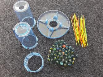 1x Game base 1x Top tube with opening on end 1x Bottom tube with opening on side 1x Tube connector with holes for sticks 50x Marbles 29x Sticks Laminated Instruction Sheet