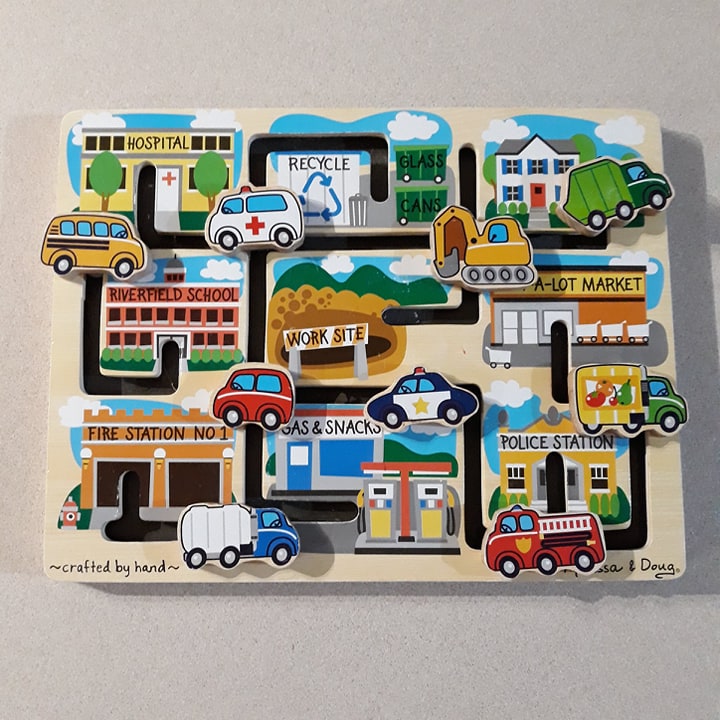 Wooden maze puzzle with 9 sliding vehicles all attached to puzzle board.